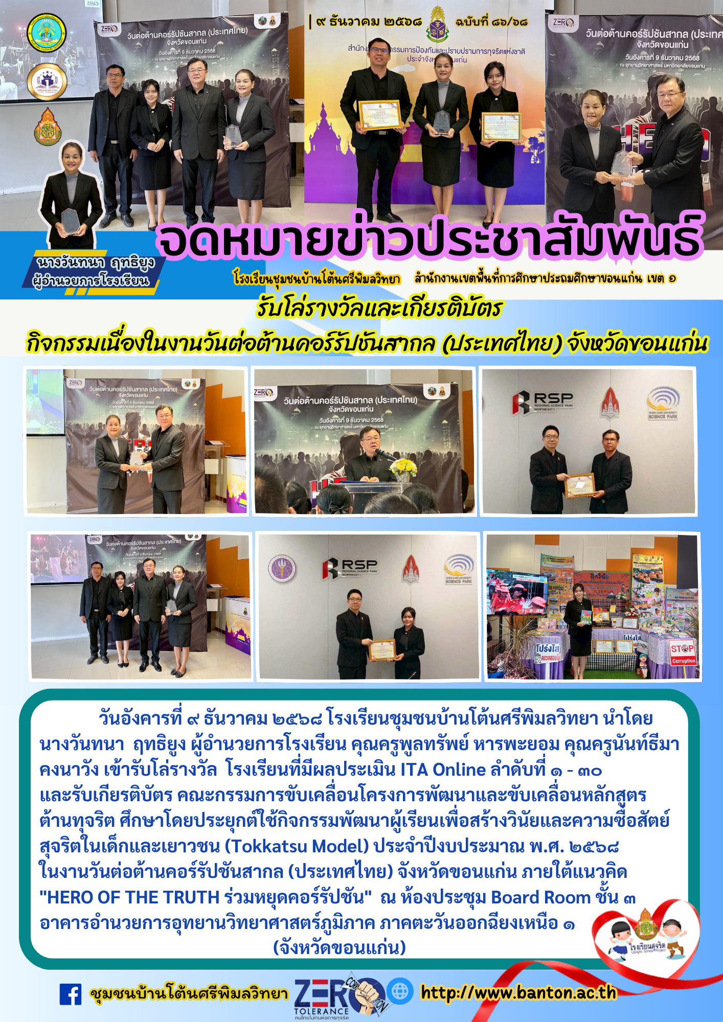 - ประชุมวางแผนเตรียมความพร้อมโครงการพัฒนาและขับเคลื่อนหลักสูตรต้านทุจริตศึกษาโดยประยุกต์ใช้ในกิจกรรมพัฒนาผู้เรียนเพื่อสร้างวินัย และความซื่อสัตย์สุจริตในเด็กและเยาวชน (Tokkatsu Model) ปีงบประมาณ ๒๕๖๙